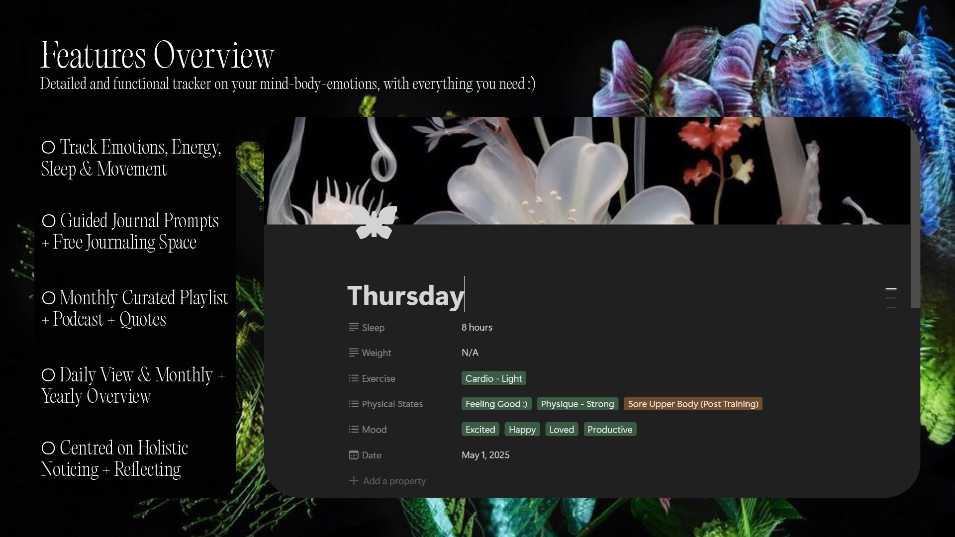 Weekly and Monthly Overviews:Reflect on your emotional journey and set mindful intentions moving forward.