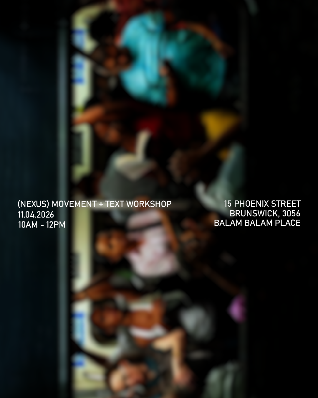 Welcome to (nexus) Movement + Text Workshop! This workshop explores improvised movement with text (spoken, written, visual), expanding participants’ physical and cognitive capacities to generate new movement ideas.